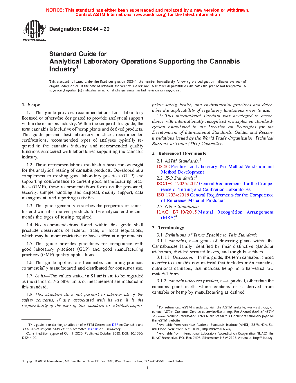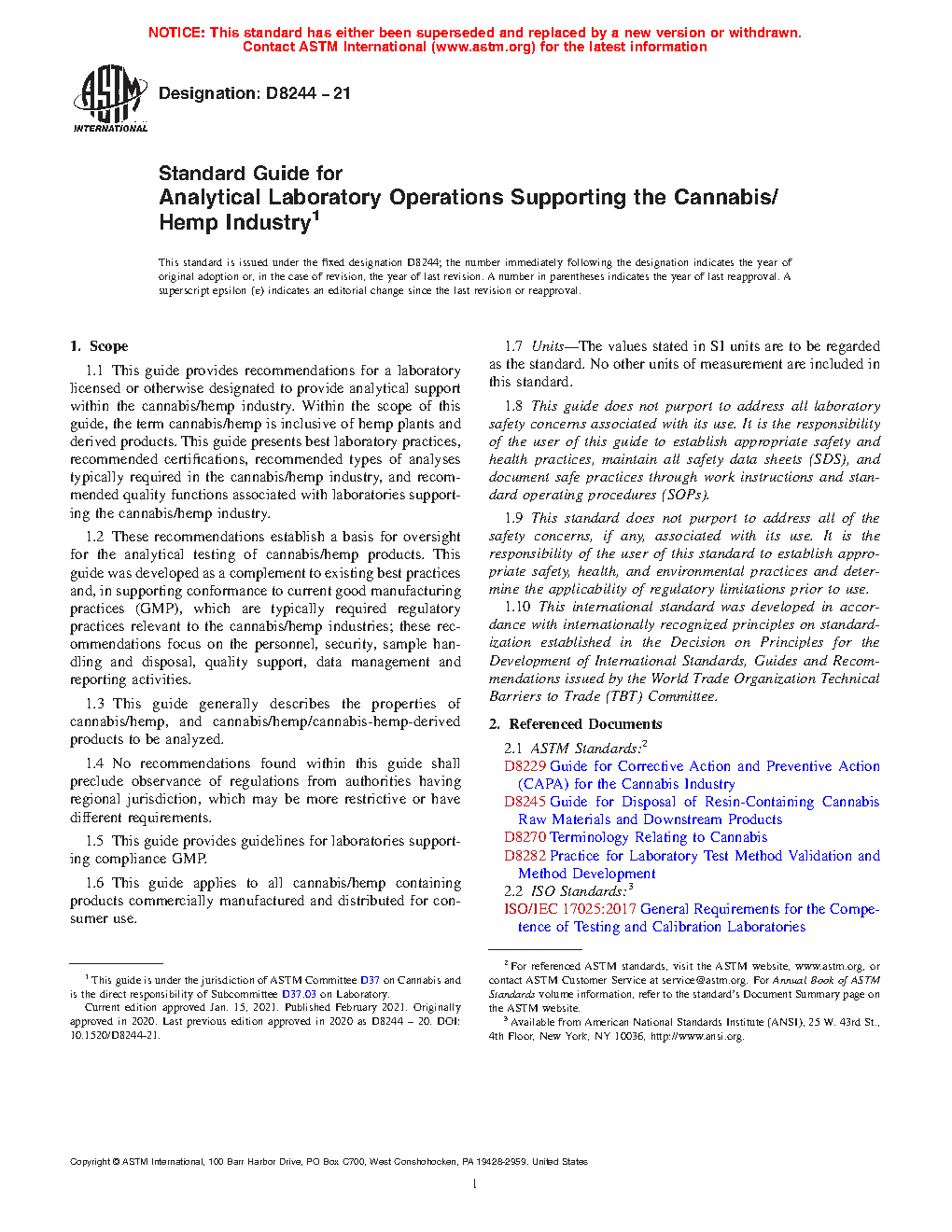 1.1 This guide provides recommendations for a laboratory licensed or otherwise designated to provide analytical support within the cannabis/hemp industry. Within the scope of this guide, the term cannabis/hemp is inclusive of hemp plants and derived products. This guide presents best laboratory practices, recommended certifications, recommended types of analyses typically required in the cannabis/hemp industry, and recommended quality functions associated with laboratories supporting the cannabis/hemp industry.