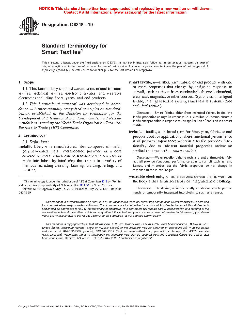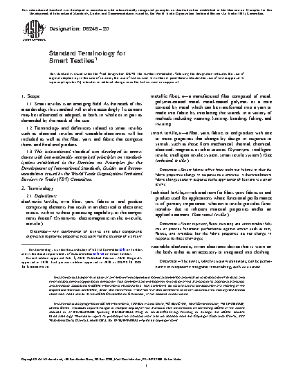 1.2 Terminology and definitions related to smart textiles such as electrical textiles and wearable electronics will be included as well as the fiber, yarn, and fabric that compose them, and final end products.