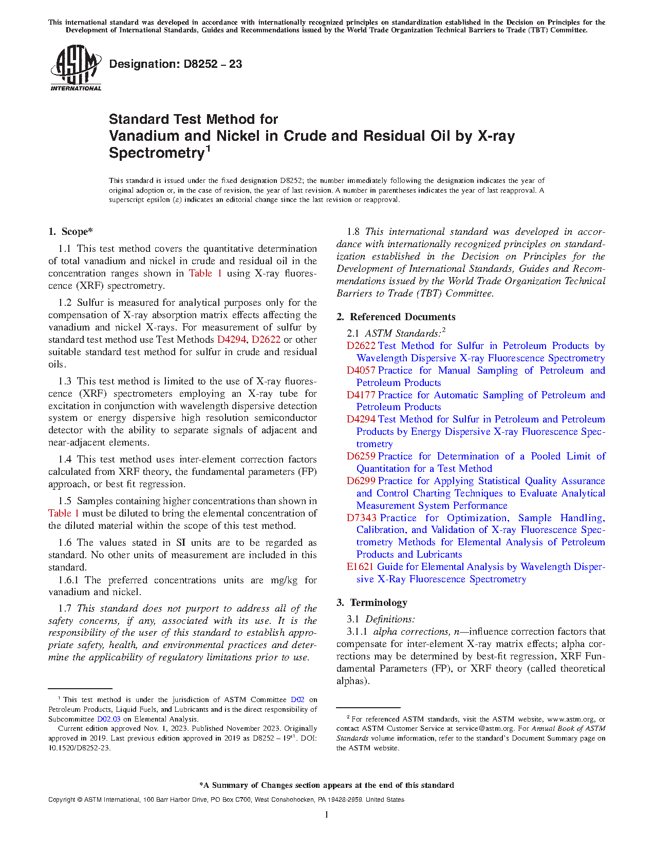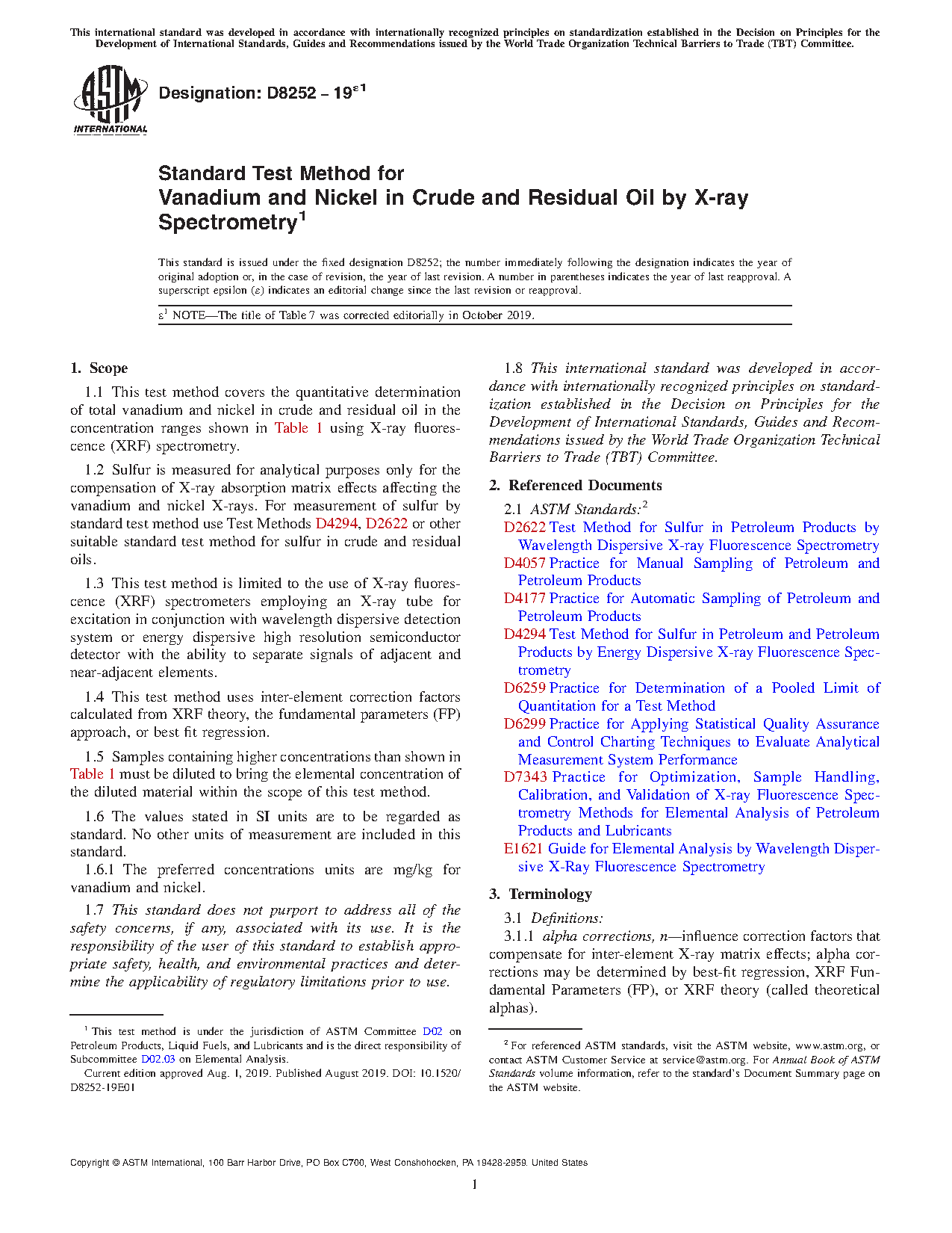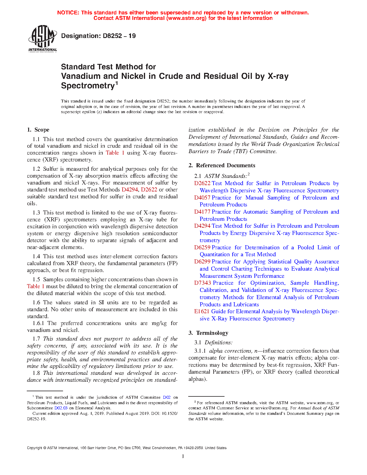 1.1 This test method covers the quantitative determination of total vanadium and nickel in crude and residual oil in the concentration ranges shown in Table 1 using X-ray fluorescence (XRF) spectrometry.