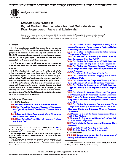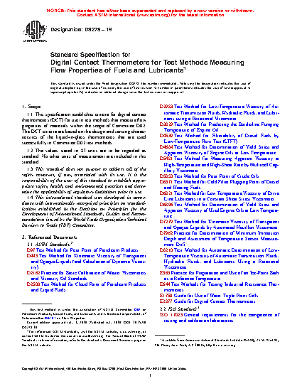 1.1 This specification establishes criteria for digital contact thermometers (DCT) for use in test methods that measure flow properties of materials within the scope of Committee D02. The DCT criteria are based on the design and sensing characteristics of the liquid-in-glass thermometers that are used successfully in Committee D02 test methods.