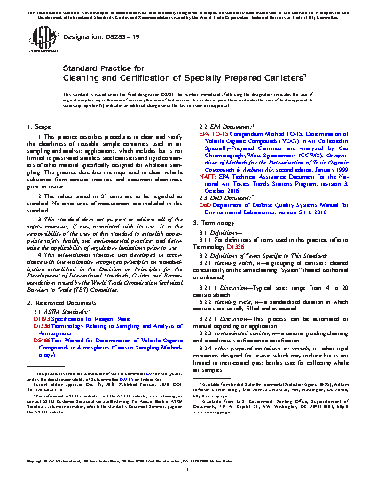 1.1 This practice describes procedures to clean and verify the cleanliness of reusable sample containers used in air sampling and analysis applications, which includes but is not limited to passivated stainless steel canisters and rigid containers of other material specifically designed for whole-air sampling. This practice describes the steps used to clean volatile substance from canister interiors and document cleanliness prior to re-use.
