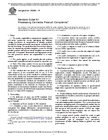 1.1 This guide is applicable to organizations engaged in the cultivation, processing, testing, packaging and labeling, storage, distribution, or transportation of cannabis products intended for human and animal consumption, including those derived from hemp. This guide describes the minimum requirements for maintaining a product complaint system for finished cannabis products and ensures that all complaints are received, processed, investigated, documented, and appropriate corrective and preventive actions are implemented in a timely manner.