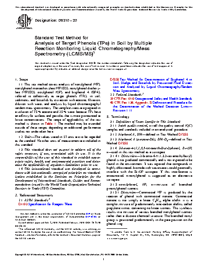 1.1 This test method covers analysis of nonylphenol (NP), nonylphenol monoethoxylate (NP1EO), nonylphenol diethoxylate (NP2EO), octylphenol (OP), and bisphenol A (BPA), referred to collectively as target phenols (TPs), in soil, sediments, and biosolids by extraction with acetone, filtration, dilution with water, and analysis by liquid chromatography/tandem mass spectrometry. The sample extracts are prepared in a solution of 75 % acetone and 25 % water because TPs have an affinity for surfaces and particles that is more pronounced at lower concentrations. The range of applicability of the test method is shown in Table 1. The method may be extended outside of these ranges depending on additional performance studies not undertaken here.