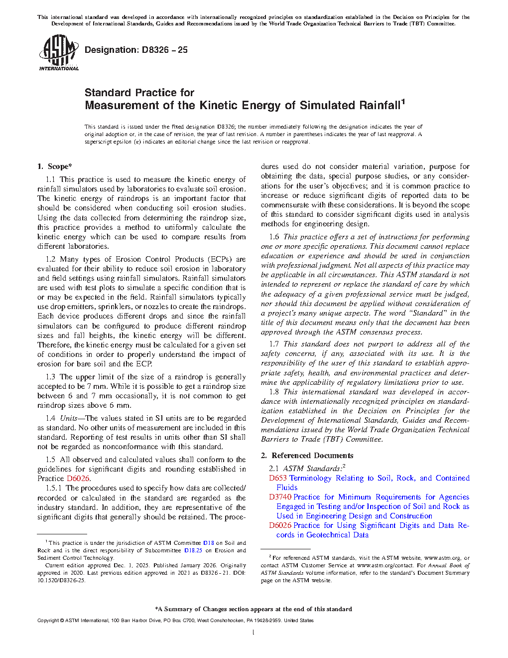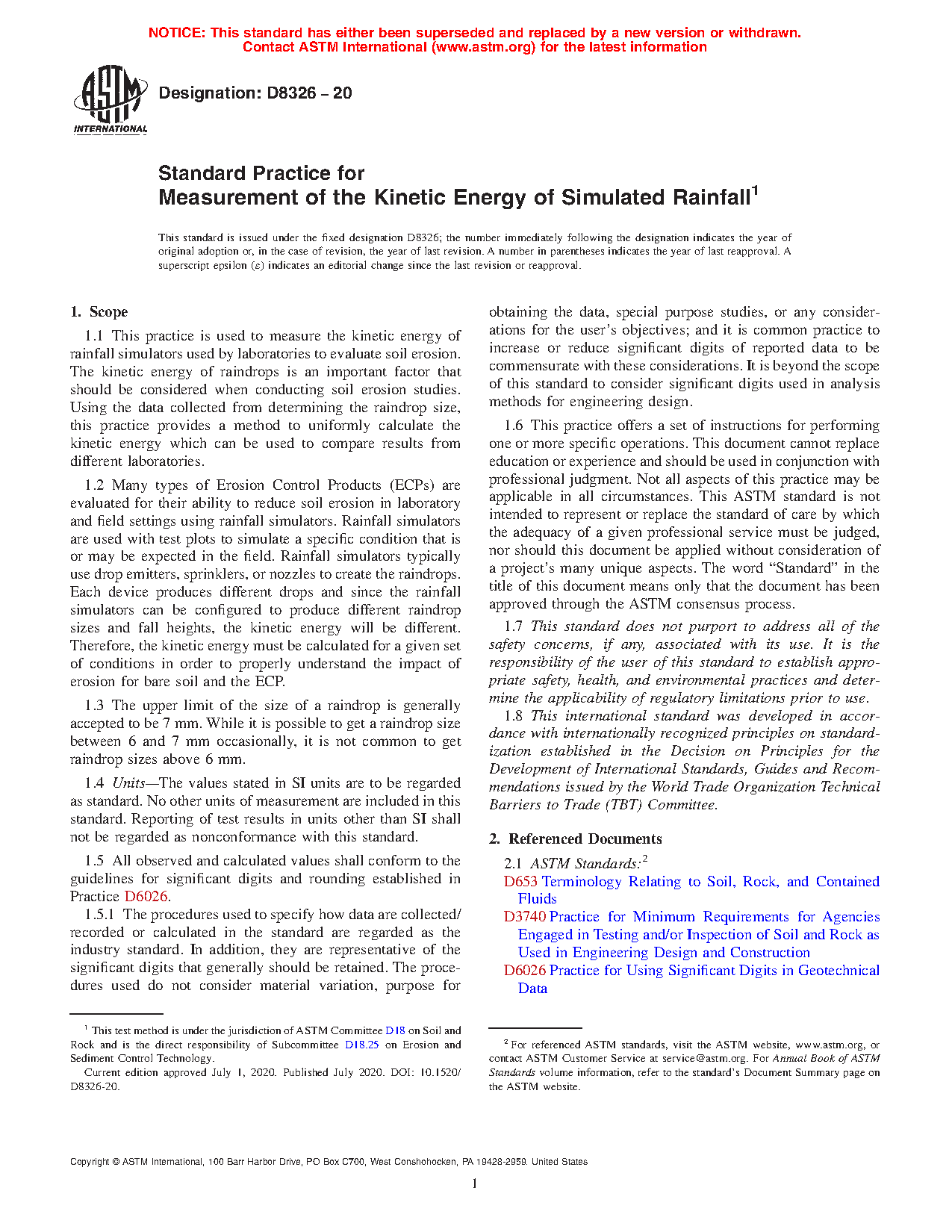 1.1 This practice is used to measure the kinetic energy of rainfall simulators used by laboratories to evaluate soil erosion. The kinetic energy of raindrops is an important factor that should be considered when conducting soil erosion studies. Using the data collected from determining the raindrop size, this practice provides a method to uniformly calculate the kinetic energy which can be used to compare results from different laboratories.