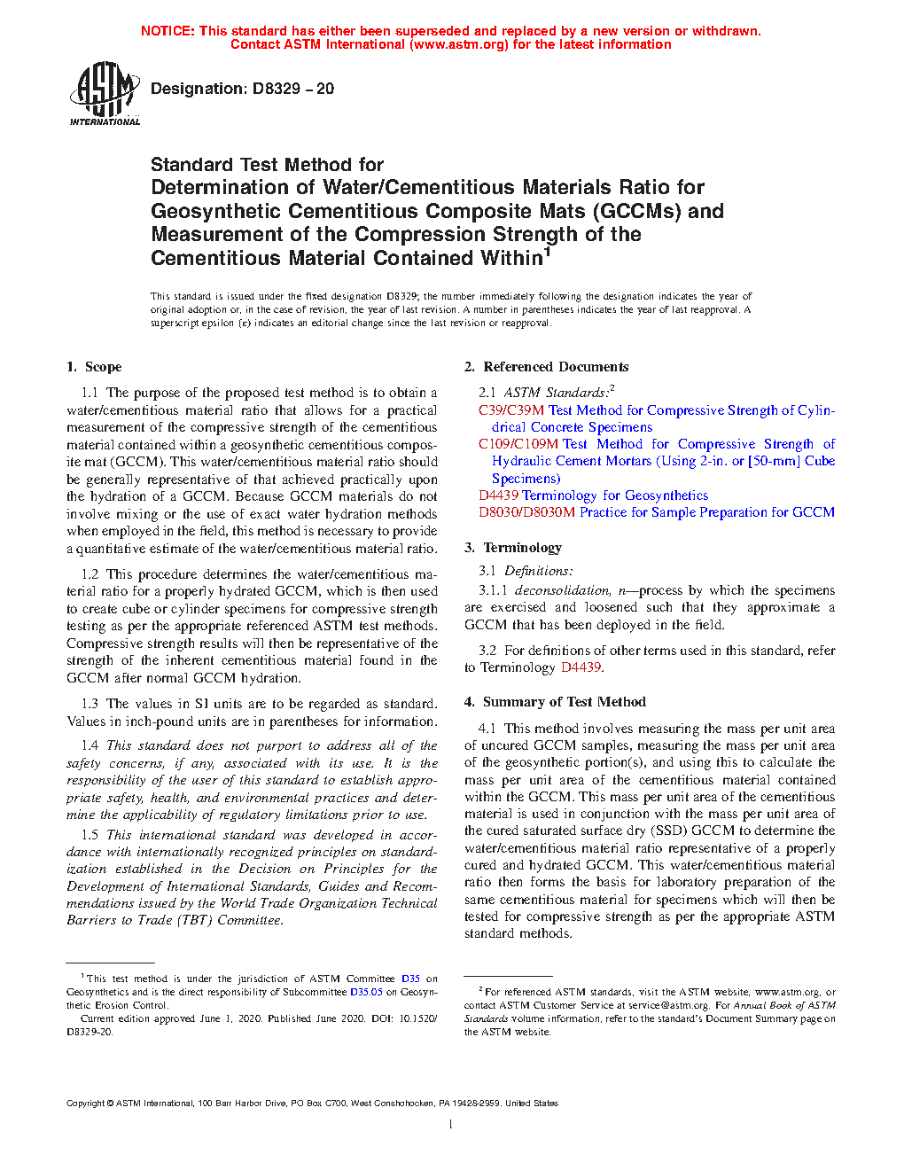 1.2 This procedure determines the water/cementitious material ratio for a properly hydrated GCCM, which is then used to create cube or cylinder specimens for compressive strength testing as per the appropriate referenced ASTM test methods. Compressive strength results will then be representative of the strength of the inherent cementitious material found in the GCCM after normal GCCM hydration.