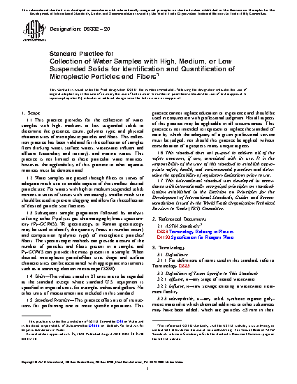 1.1 This practice provides for the collection of water samples with high, medium, or low suspended solids to determine the presence, count, polymer type, and physical characteristics of microplastic particles and fibers. This collection practice has been validated for the collection of samples from drinking water, surface waters, wastewater influent and effluent (secondary and tertiary), and marine waters. This practice is not limited to these particular water matrices; however, the applicability of this practice to other aqueous matrices must be demonstrated.