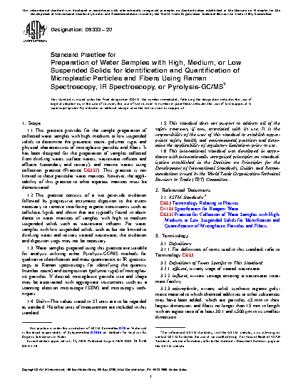 1.1 This practice provides for the sample preparation of collected water samples with high, medium, or low suspended solids to determine the presence, count, polymer type, and physical characteristics of microplastic particles and fibers. It has been designed for the preparation of samples collected from drinking water, surface waters, wastewater influent and effluent (secondary and tertiary), and marine waters using collection practice (Practice D8332). This practice is not limited to these particular water matrices; however, the applicability of this practice to other aqueous matrices must be demonstrated.
