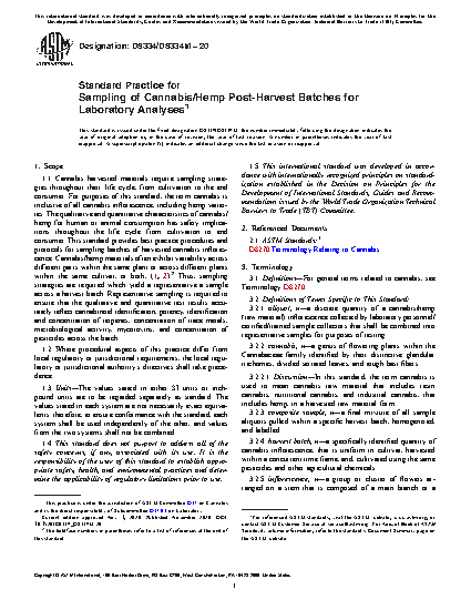 1.1 Cannabis harvested materials require sampling strategies throughout their life cycle, from cultivation to the end consumer. For purposes of this standard, the term cannabis is inclusive of all cannabis inflorescence, including hemp varieties. The qualitative and quantitative characteristics of cannabis/hemp for human or animal consumption has safety implications throughout the life cycle from cultivation to end consumer. This standard provides best practice procedures and protocols for sampling batches of harvested cannabis inflorescence. Cannabis/hemp materials often exhibit variability across different parts within the same plant or across different plants within the same cultivar, or both, (1, 2).2 Thus, sampling strategies are required which yield a representative a sample across a harvest batch. Representative sampling is required to ensure that the qualitative and quantitative test results accurately reflect cannabinoid identification, potency, identification and concentration of terpenes, concentration of trace metals, microbiological activity, mycotoxins, and concentration of pesticides across the batch.