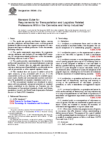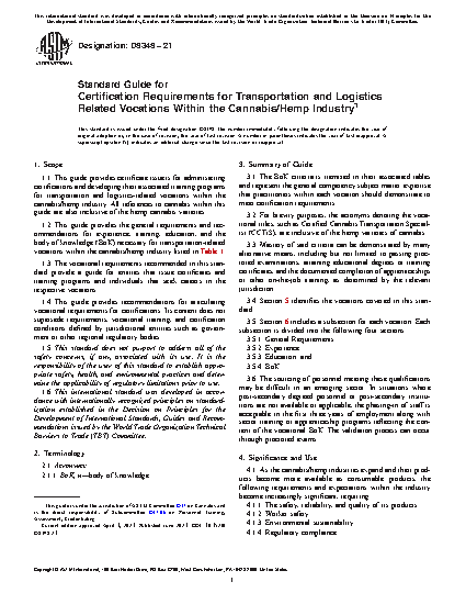 1.1 This guide provides certificate issuers for administering certifications and developing their associated training programs for transportation and logistics-related vocations within the cannabis/hemp industry. All references to cannabis within this guide are also inclusive of the hemp cannabis varieties.