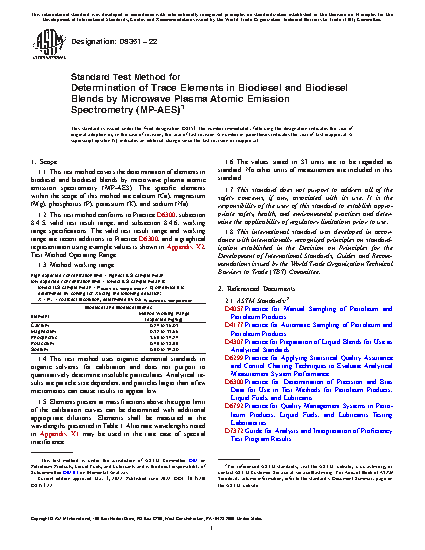 5.1 This test method covers the determination of five elements (Ca, Mg, K, Na, and P) in biodiesel and biodiesel blends.