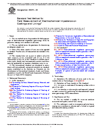 4.8 The electrochemical impedance measurements shall be interpreted by engineers or technical specialists experienced in the fields of protective coatings and corrosion testing. It is often necessary to use other data such as visual inspection, dry film thickness, and adhesion testing, in addition to electrochemical impedance, to formulate conclusions concerning corrosion activity of the underlying structure or the remaining service life of the coating system. See Test Methods D660, D661, D714, or Practice D610 for more information on coating visual inspection.