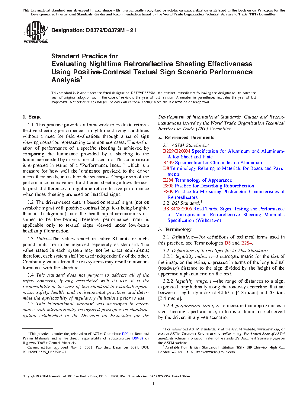 1.1 This practice provides a framework to evaluate retroreflective sheeting performance in nighttime driving conditions without a need for field evaluations through a set of sign viewing scenarios representing common use-cases. The evaluation of performance of a specific sheeting is achieved by comparing the luminance provided by a sheeting to the luminance needed by drivers in each scenario. This comparison is expressed in terms of a “Performance Index,” which is a measure for how well the luminance provided to the driver meets their needs, in each of the scenarios. Comparison of the performance index values for different sheeting allows the user to predict differences in nighttime retroreflective performance when those sheeting are used on installed signs.