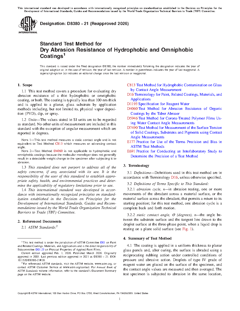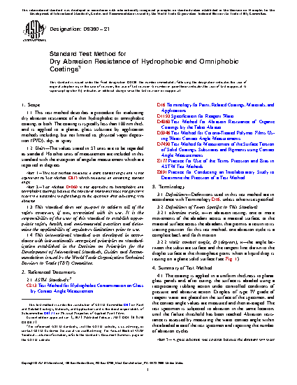 1.1 This test method describes a procedure for evaluating dry abrasion resistance of a thin hydrophobic or omniphobic coating, or both. The coating is typically less than 100 nm thick and is applied to a planar, glass substrate by application methods including, but not limited to, physical vapor deposition (PVD), dip, or spray.