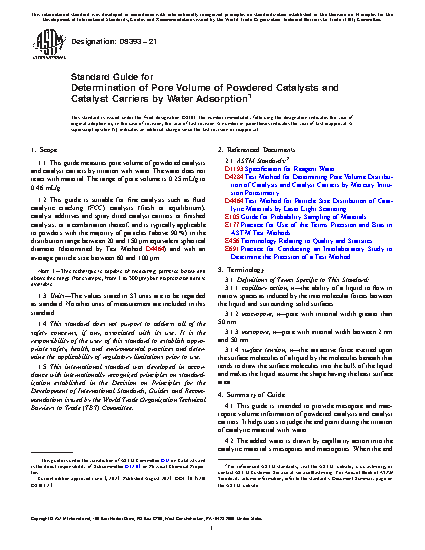 1.1 This guide measures pore volume of powdered catalysts and catalyst carriers by titration with water. The water does not react with material. The range of pore volume is 0.25 mL/g to 0.46 mL/g.