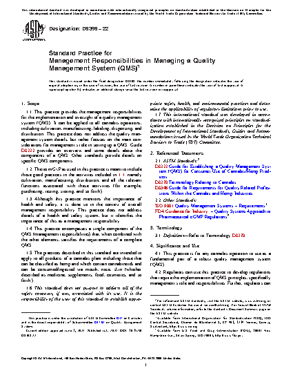 1.1 This practice provides the management responsibilities for the implementation and oversight of a quality management system (QMS). It can be applied to all cannabis operations, including cultivation, manufacturing, labeling, dispensing, and distribution. This practice does not address the quality management system details, but rather focuses on the main considerations for management’s role in setting up a QMS. Guide D8222 provides an overview and some details about the components of a QMS. Other standards provide details on specific QMS components.