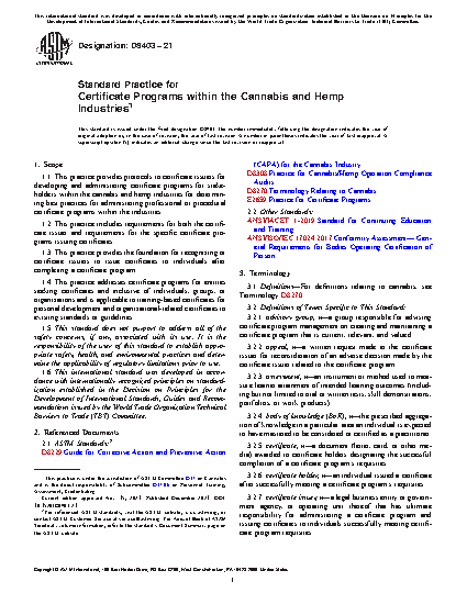1.1 This practice provides protocols to certificate issuers for developing and administering certificate programs for stakeholders within the cannabis and hemp industries for determining best practices for administering professional or procedural certificate programs within the industries.
