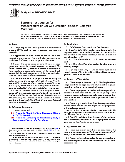 1.1 The jet cup attrition test is applicable to fluid catalytic cracking (FCC) catalysts, catalyst additives, and catalytic materials.