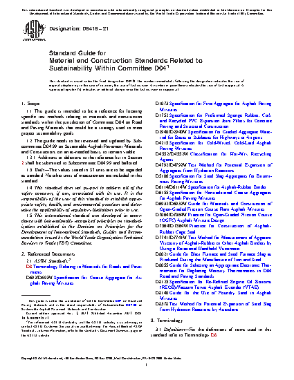 5.1 This guide provides a list of the standards within Committee D04 that address the use of materials, specifications, and construction practices that could have broader sustainability benefits. This list is current, relative to the approval date of the standard.