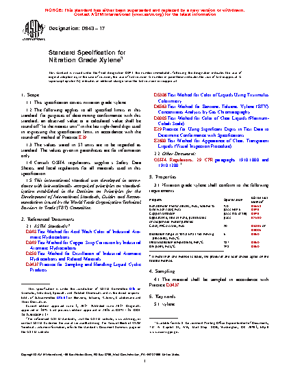 This specification covers nitration grade xylene. The nonaromatic hydrocarbons, acid wash color, copper corrosion, appearance, distillation range, initial distillation temperature, and dry point of nitration grade xylene shall be tested to meet the requirements prescribed.