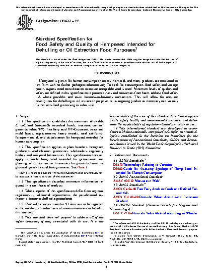 1.1 This specification establishes the maximum allowable E. coli and Salmonella microbial levels, moisture content, peroxide value (PV), free fatty acid (FFA) content, yeast and mold levels, representative heavy metals, total coliforms, foreign material, and discoloration for hempseed intended for human consumption.