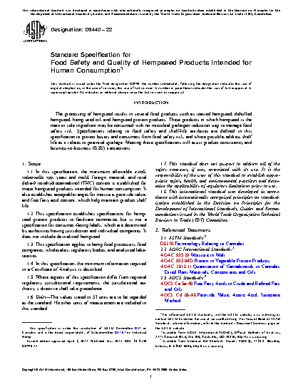 1.1 In this specification, the maximum allowable e.coli, salmonella spp, yeast and mold, foreign material, and total delta-9 tetrahydrocannabinol (THC) content is established for major hempseed products intended for human consumption. It also establishes acceptable ranges for moisture, peroxide value, and free fatty acid content, which help maintain product shelf life.