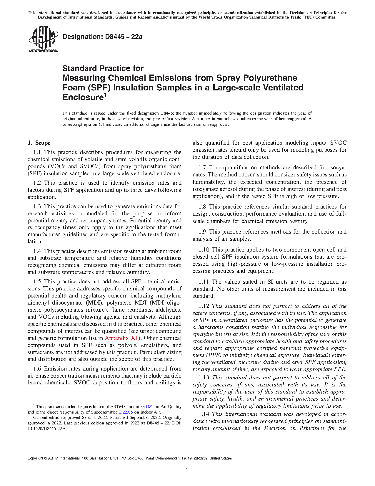 1.1 This practice describes procedures for measuring the chemical emissions of volatile and semi-volatile organic compounds (VOCs and SVOCs) from spray polyurethane foam (SPF) insulation samples in a large-scale ventilated enclosure.