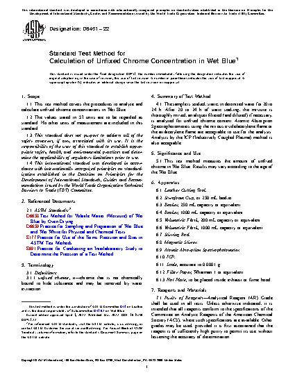 5.1 This test method measures the amount of unfixed chrome in Wet Blue. Results may vary according to the age of the Wet Blue.