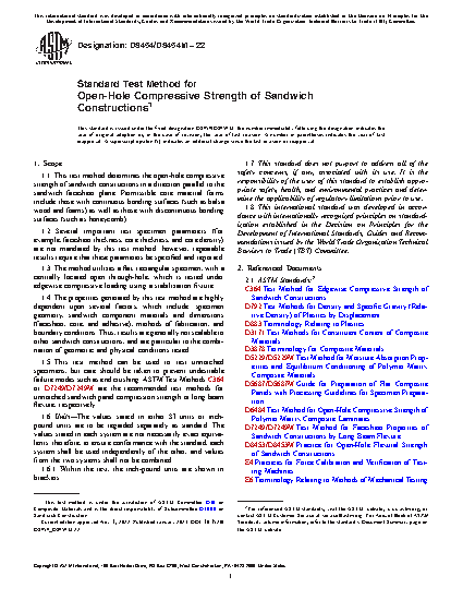 1.1 This test method determines the open-hole compressive strength of sandwich constructions in a direction parallel to the sandwich facesheet plane. Permissible core material forms include those with continuous bonding surfaces (such as balsa wood and foams) as well as those with discontinuous bonding surfaces (such as honeycomb).