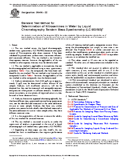 1.1 This test method covers the liquid chromatography tandem mass spectrometry (LC-MS/MS) detection and quantitation of N-nitrosamines after direct injection. It has been validated for groundwater, surface water, wastewater influents, and wastewater effluents. This test method is not limited to these aqueous matrices; however, the applicability of this test method to other aqueous matrices must be demonstrated.