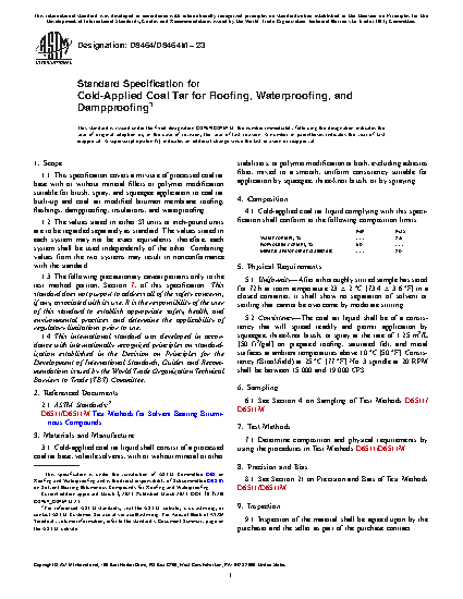 1.1 This specification covers a mixture of processed coal tar base with or without mineral fillers or polymer modification suitable for brush, spray, and squeegee application to coal tar built-up and coal tar modified bitumen membrane roofing, flashings, dampproofing, insulations, and waterproofing.