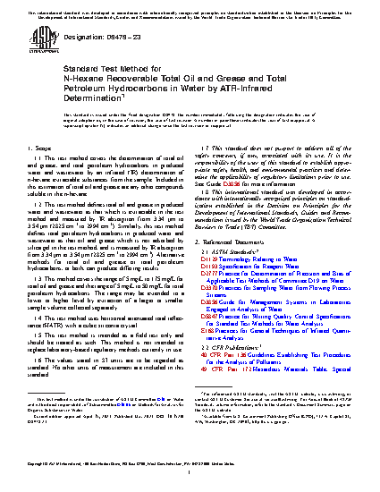 1.1 This test method covers the determination of total oil and grease, and total petroleum hydrocarbons in produced water and wastewater by an infrared (IR) determination of n-hexane extractable substances from the sample. Included in this estimation of total oil and grease are any other compounds soluble in the n-hexane.