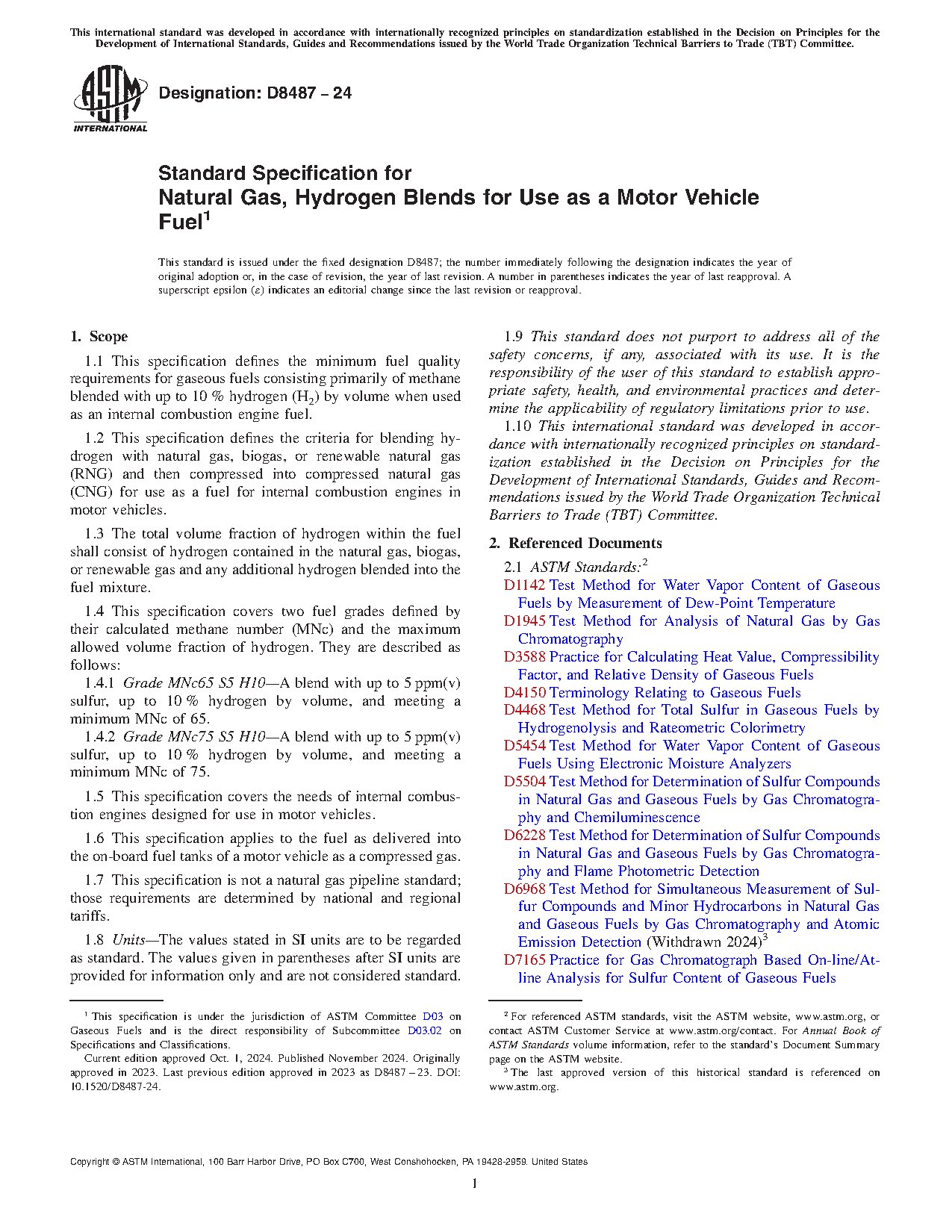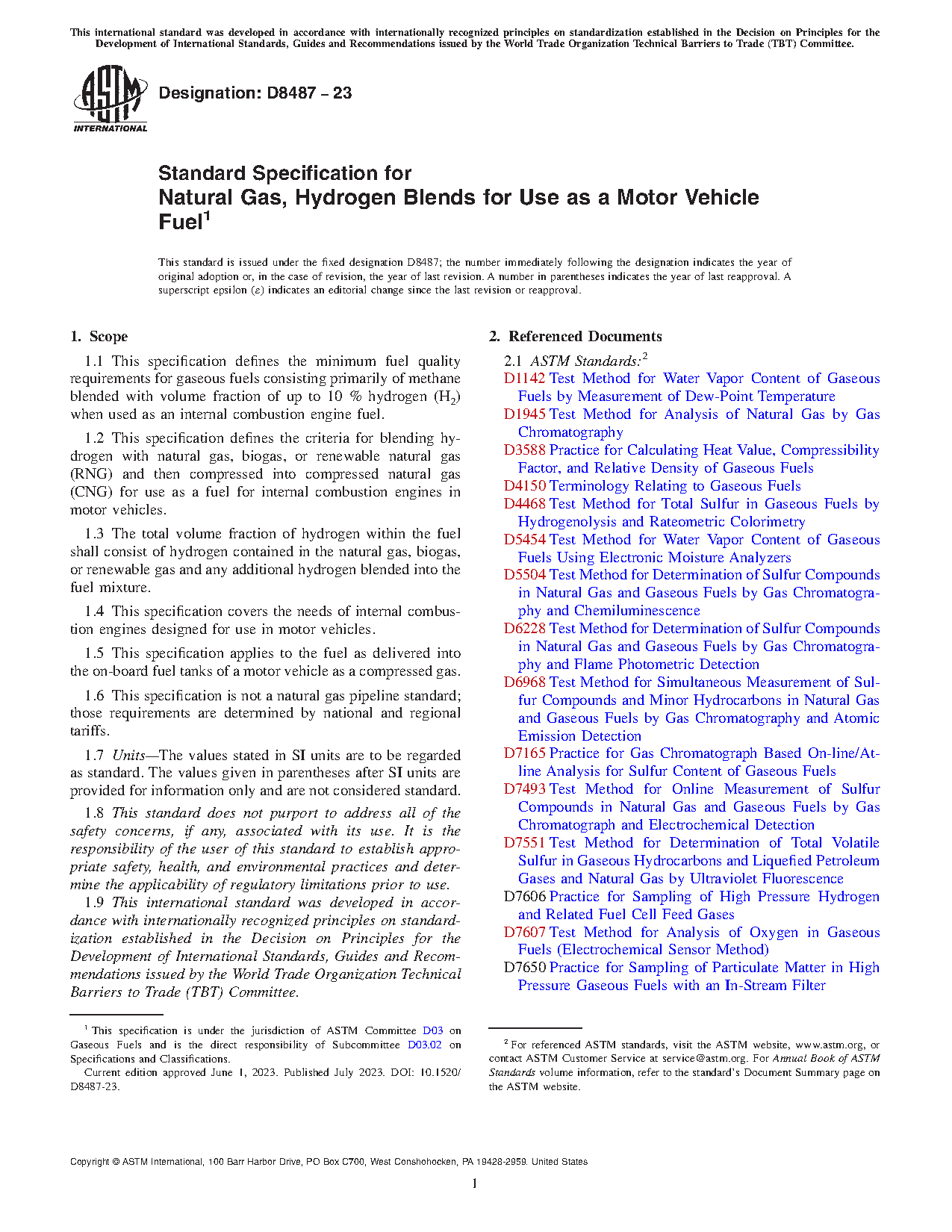 1.2 This specification defines the criteria for blending hydrogen with natural gas, biogas, or renewable natural gas (RNG) and then compressed into compressed natural gas (CNG) for use as a fuel for internal combustion engines in motor vehicles.