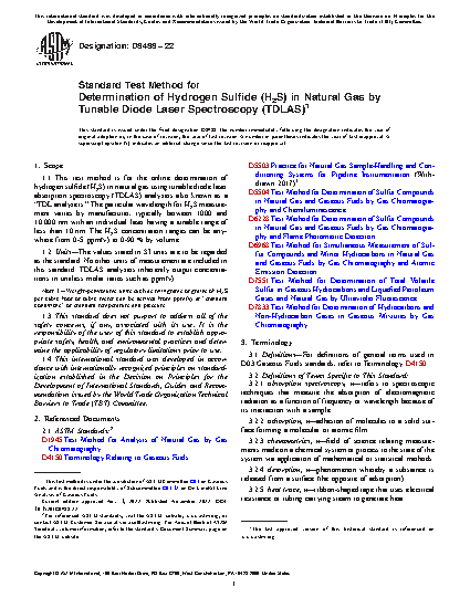 1.1 This test method is for the online determination of hydrogen sulfide (H2S) in natural gas using tunable diode laser absorption spectroscopy (TDLAS) analyzers also known as a “TDL analyzers.” The particular wavelength for H2S measurement varies by manufacturer, typically between 1000 and 10 000 nm with an individual laser having a tunable range of less than 10 nm. The H2S concentration ranges can be anywhere from 0-5 ppm(v) to 0-90 % by volume.