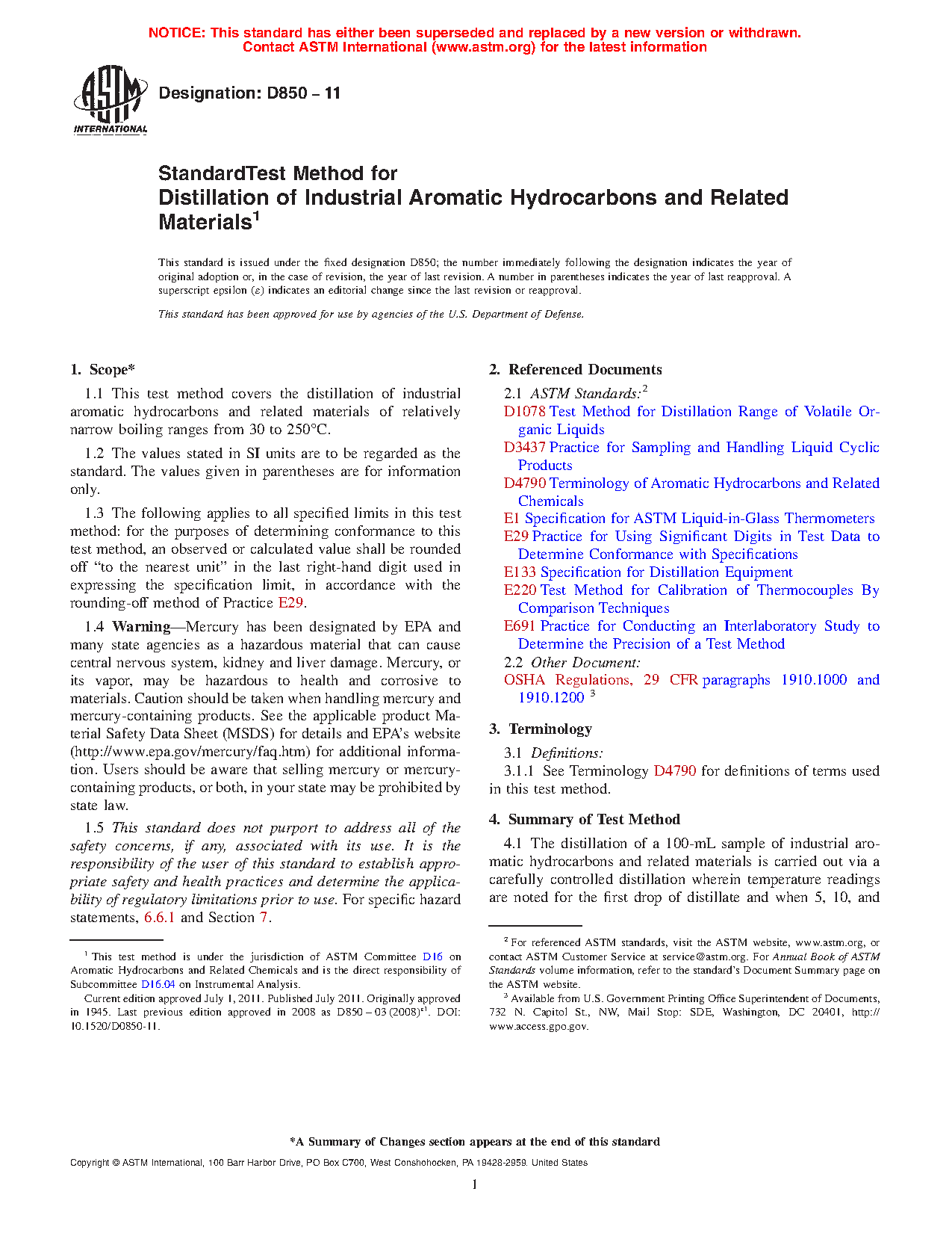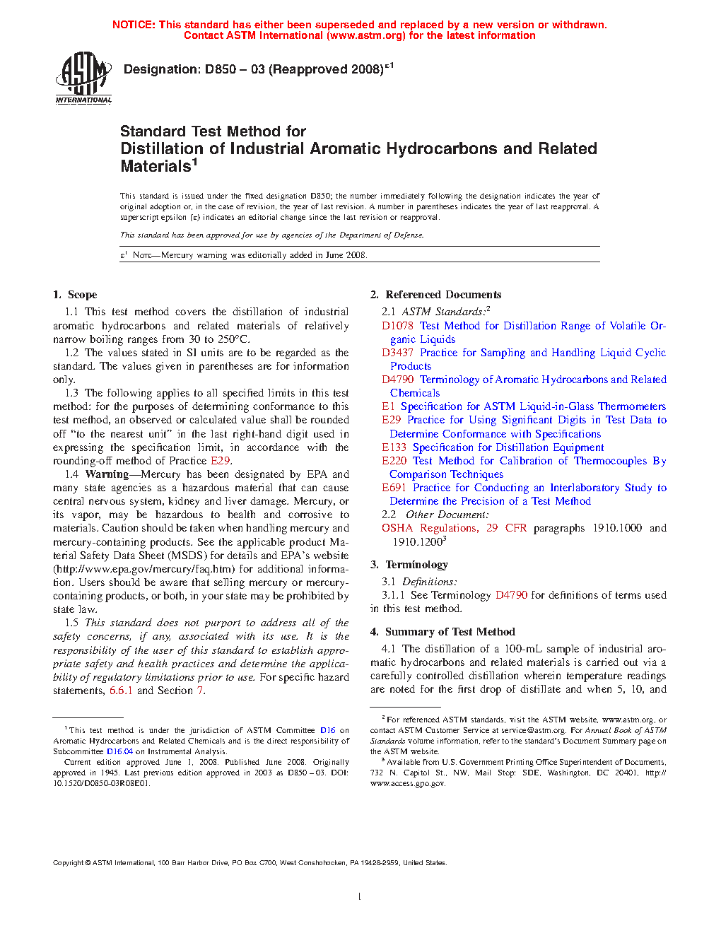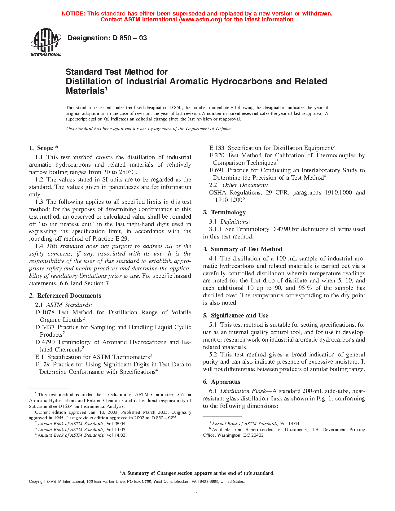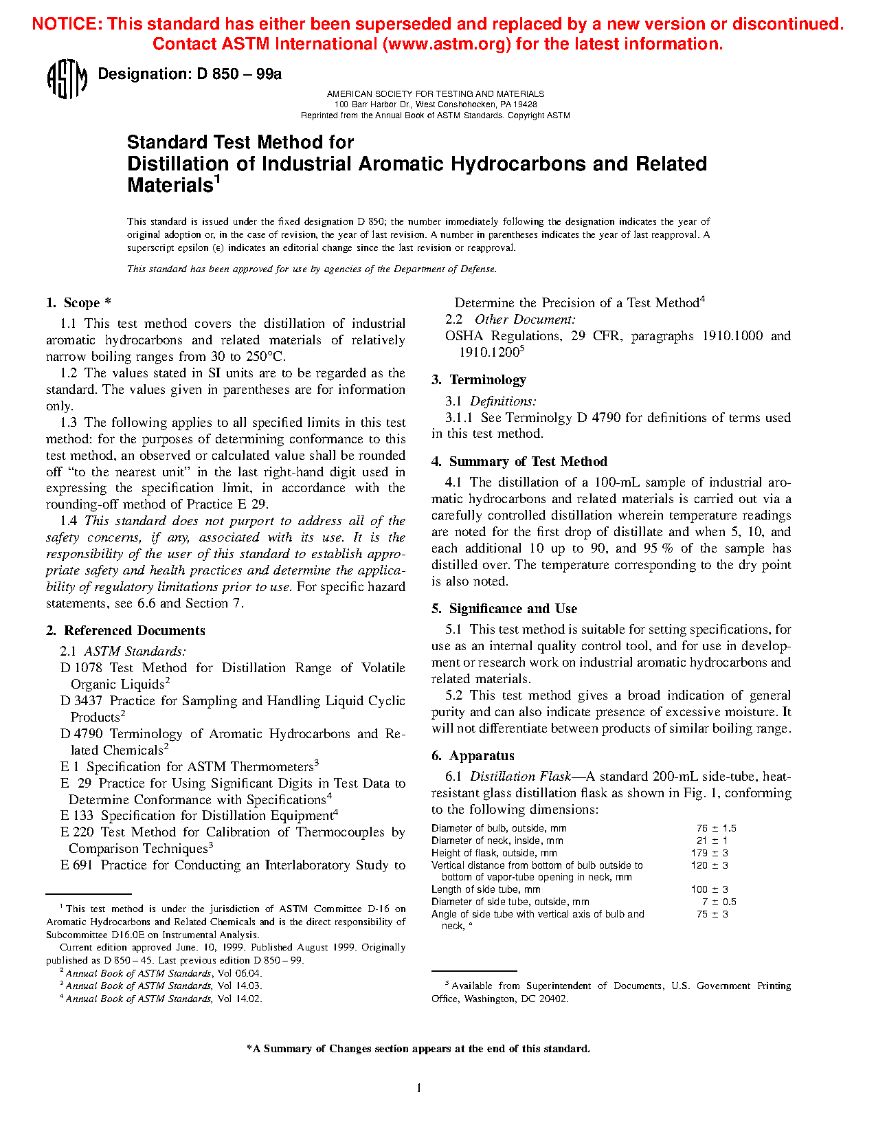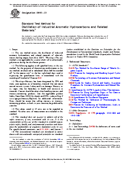 1.1 This test method covers the distillation of industrial aromatic hydrocarbons and related materials of relatively narrow boiling ranges from 30 to 250°C. Warning—This test method is not applicable for styrene which will exothermically polymerize during the distillation process.