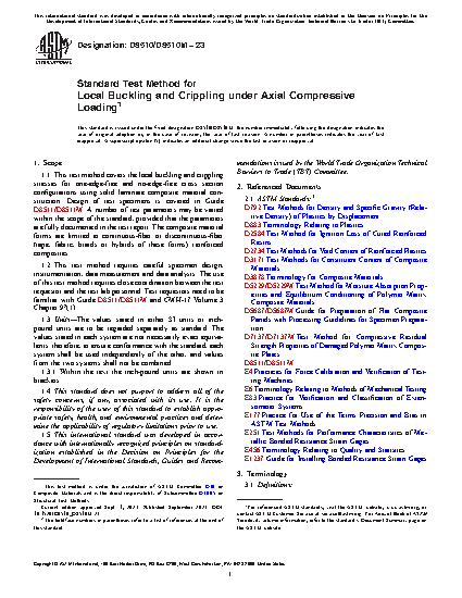 1.1 This test method covers the local buckling and crippling stresses for one-edge-free and no-edge-free cross section configurations using solid laminate composite material construction. Design of test specimens is covered in Guide D8511/D8511M. A number of test parameters may be varied within the scope of the standard, provided that the parameters are fully documented in the test report. The composite material forms are limited to continuous-fiber or discontinuous-fiber (tape, fabric, braids or hybrids of these forms) reinforced composites.