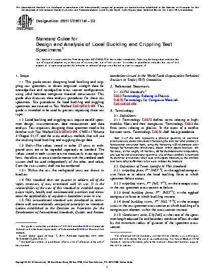 1.1 This guide covers designing local buckling and crippling test specimens to obtain empirical strength data for one-edge-free and no-edge-free cross section configurations using solid laminate composite material construction. This guide also discusses data analysis procedures for these test specimens. Test procedures for local buckling and crippling specimens are covered in Test Method D8510/D8510M. This guide is intended to be used by persons requesting these test types.