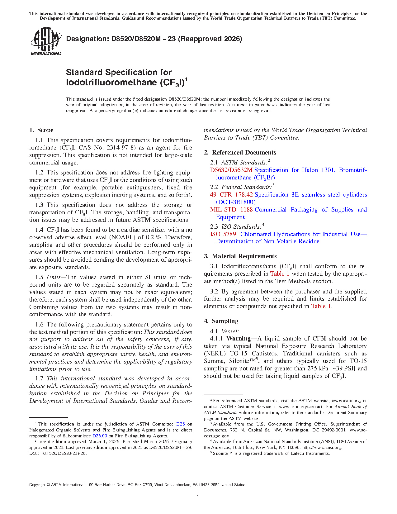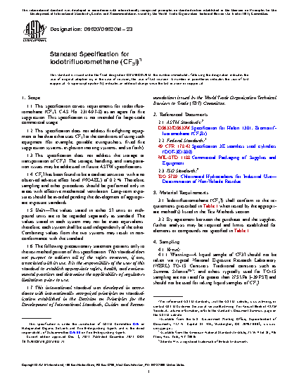 1.1 This specification covers requirements for iodotrifluoromethane (CF3I, CAS No. 2314-97-8) as an agent for fire suppression. This specification is not intended for large-scale commercial usage.