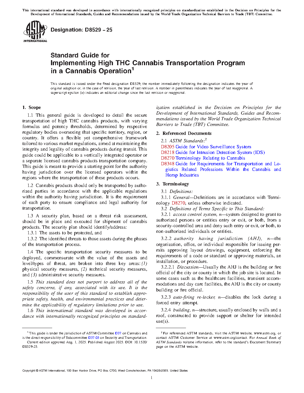 1.1 This general guide is developed to detail the secure transportation of high THC cannabis products, with varying formulas and potency thresholds, determined by respective regulatory bodies overseeing that specific territory, region, or country. It offers a flexible yet comprehensive framework tailored to various market regulations, aimed at maintaining the integrity and legality of cannabis products during transit. This guide could be applicable to a vertically integrated operator or a separate licensed cannabis products transportation company. This guide is meant to provide a starting point for the authority having jurisdiction over the licensed operators within the regions where the transportation of these products occurs.