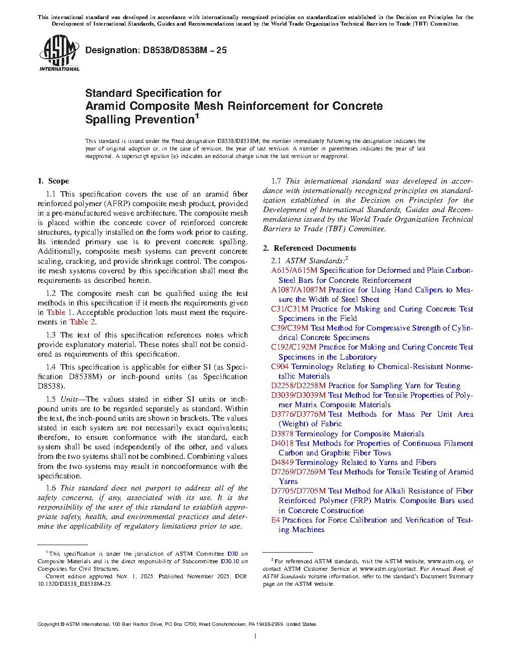 1.1 This specification covers the use of an aramid fiber reinforced polymer (AFRP) composite mesh product, provided in a pre-manufactured weave architecture. The composite mesh is placed within the concrete cover of reinforced concrete structures, typically installed on the form work prior to casting. Its intended primary use is to prevent concrete spalling. Additionally, composite mesh systems can prevent concrete scaling, cracking, and provide shrinkage control. The composite mesh systems covered by this specification shall meet the requirements as described herein.