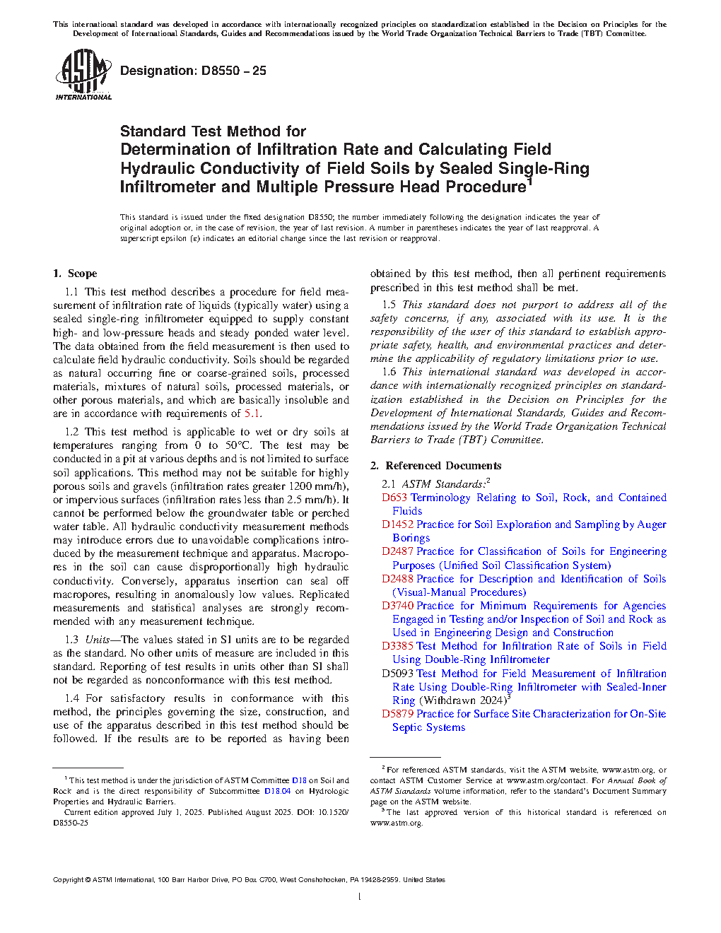 1.1 This test method describes a procedure for field measurement of infiltration rate of liquids (typically water) using a sealed single-ring infiltrometer equipped to supply constant high- and low-pressure heads and steady ponded water level. The data obtained from the field measurement is then used to calculate field hydraulic conductivity. Soils should be regarded as natural occurring fine or coarse-grained soils, processed materials, mixtures of natural soils, processed materials, or other porous materials, and which are basically insoluble and are in accordance with requirements of 5.1.