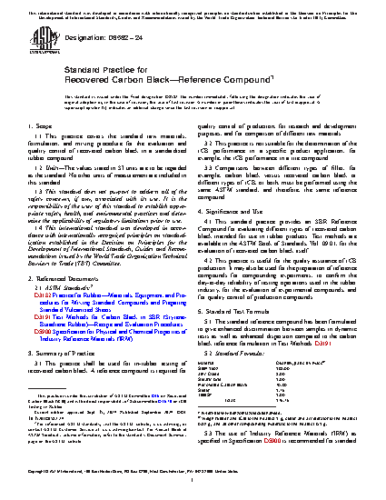 1.1 This practice covers the standard raw materials, formulation, and mixing procedure for the evaluation and quality control of recovered carbon black in a standardized rubber compound.