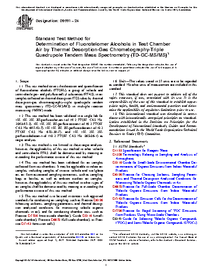 1.1 This test method covers the detection and quantification of fluorotelomer alcohols (FTOHs), a group of volatile and semivolatile per- and polyfluoroalkyl substances (PFAS), in air samples collected on thermal desorption (TD) tubes by thermal desorption-gas chromatography-triple quadrupole tandem mass spectrometry (TD-GC-MS/MS) in multiple reaction monitoring (MRM) mode.