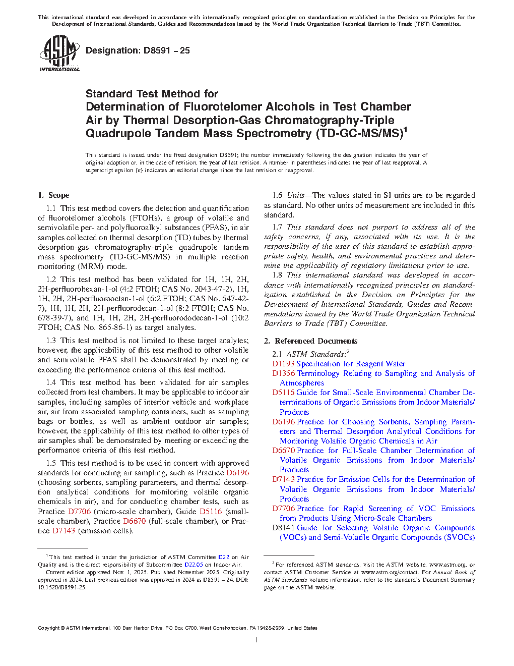 1.5 This test method is to be used in concert with approved standards for conducting air sampling, such as Practice D6196 (choosing sorbents, sampling parameters, and thermal desorption analytical conditions for monitoring volatile organic chemicals in air), and for conducting chamber tests, such as Practice D7706 (micro-scale chamber), Guide D5116 (small-scale chamber), Practice D6670 (full-scale chamber), or Practice D7143 (emission cells).
