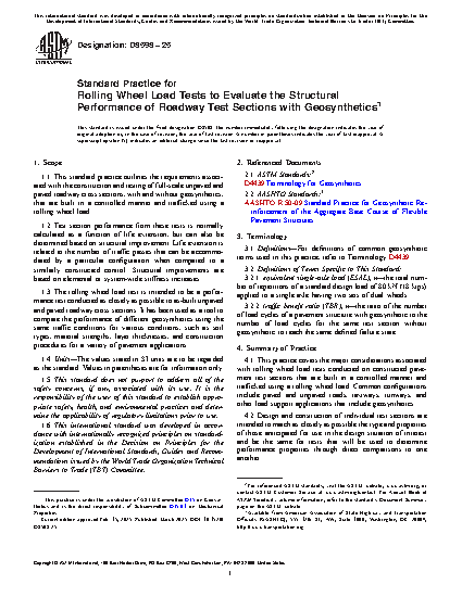1.1 This standard practice outlines the requirements associated with the construction and testing of full-scale unpaved and paved roadway cross sections, with and without geosynthetics, that are built in a controlled manner and trafficked using a rolling wheel load.