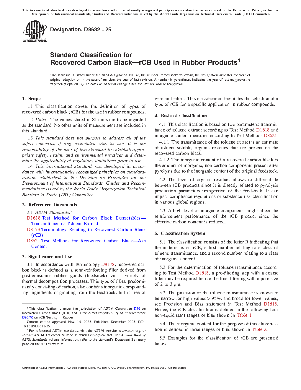 3.1 In accordance with Terminology D8178, recovered carbon black is defined as a semi-reinforcing filler derived from post-consumer rubber goods (feedstock) via a variety of thermal decomposition processes. This type of filler, predominantly consisting of carbon, also contains inorganic compounding ingredients originating from the feedstock, but is free of wire and fabric. This classification facilitates the selection of a type of rCB for a specific application in rubber compounds.