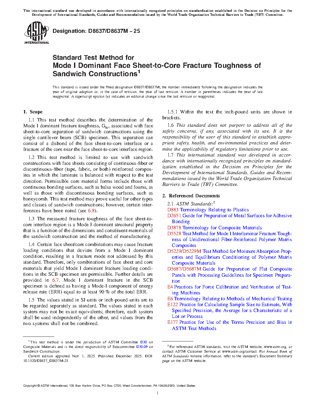 1.3 The measured fracture toughness of the face sheet-to-core interface region is a Mode I dominant structural property that is a function of the dimensions and constituent materials of the sandwich construction and the method of manufacturing.