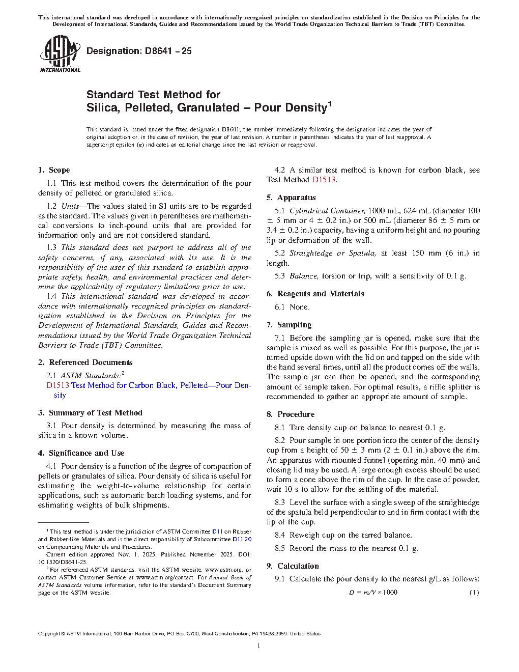 1.1 This test method covers the determination of the pour density of pelleted or granulated silica.