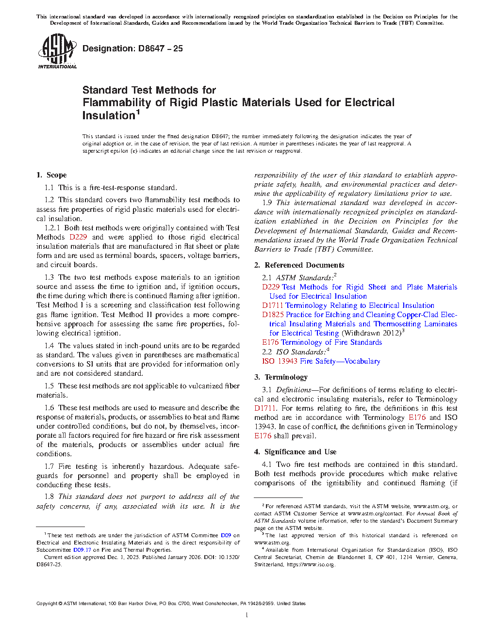 1.2 This standard covers two flammability test methods to assess fire properties of rigid plastic materials used for electrical insulation.