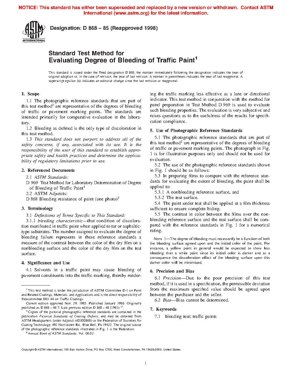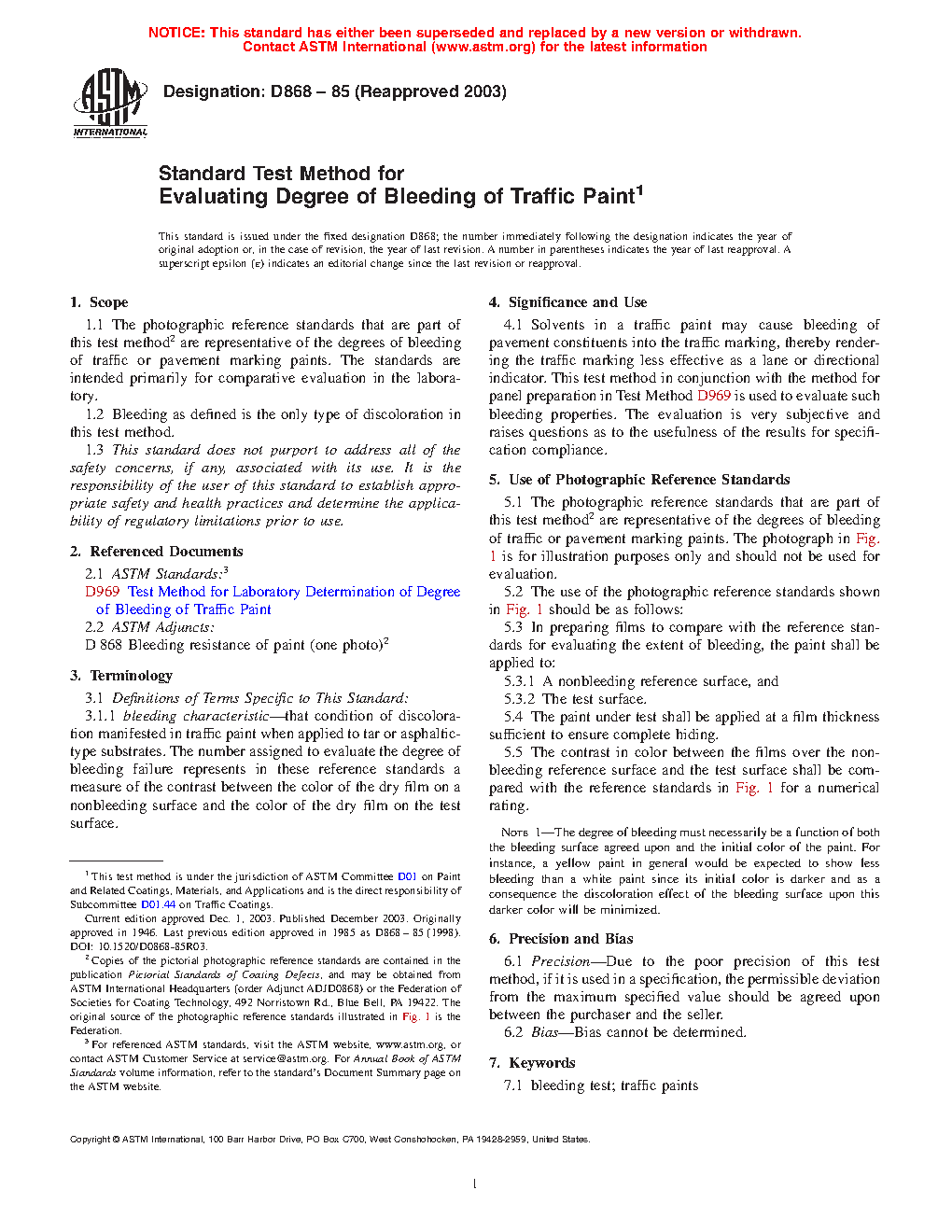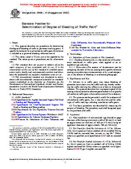 1.1 This practice describes test procedures for determining the degree of bleeding of traffic or pavement marking paints. A specific formulation for a solventborne traffic paint formulation is included as a potential bleeding reference control.