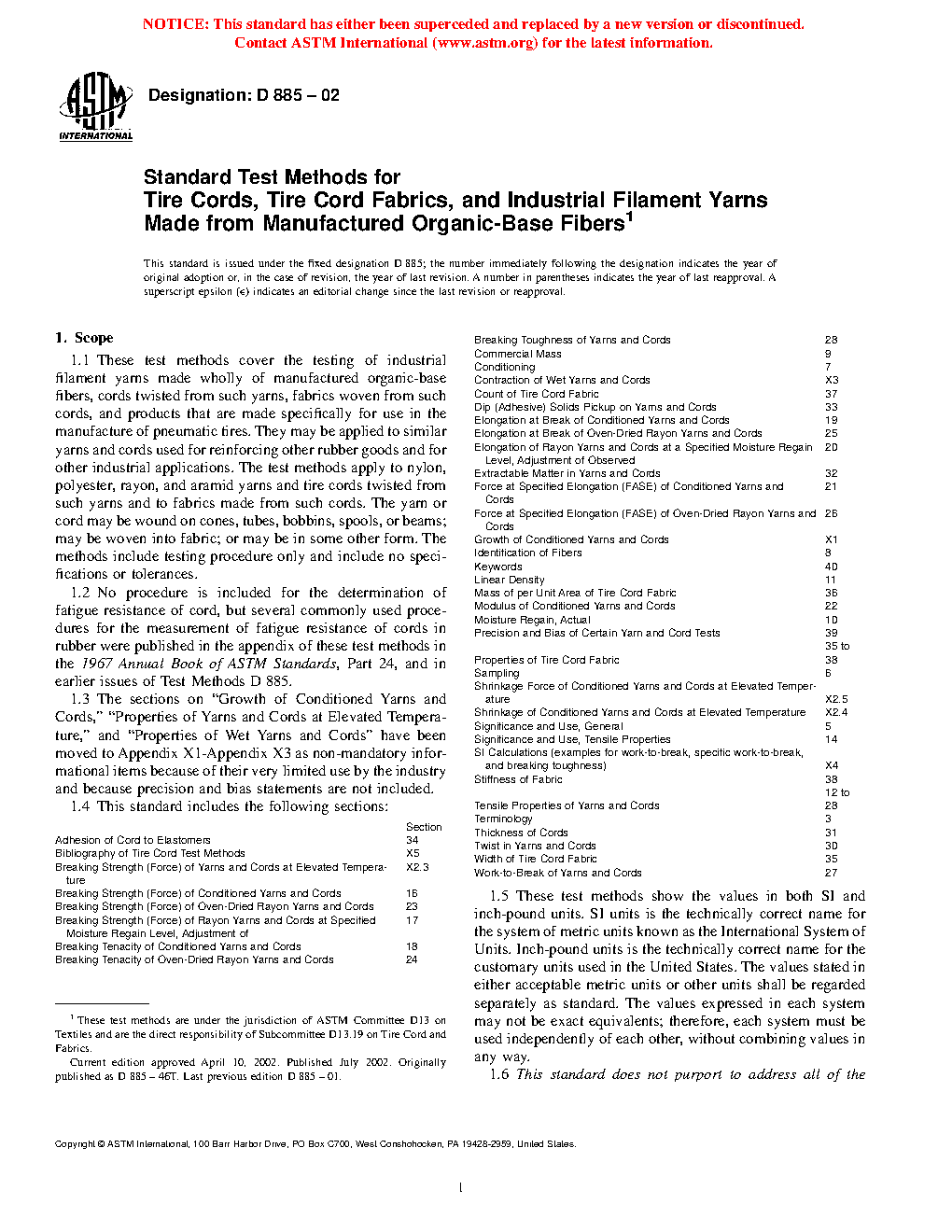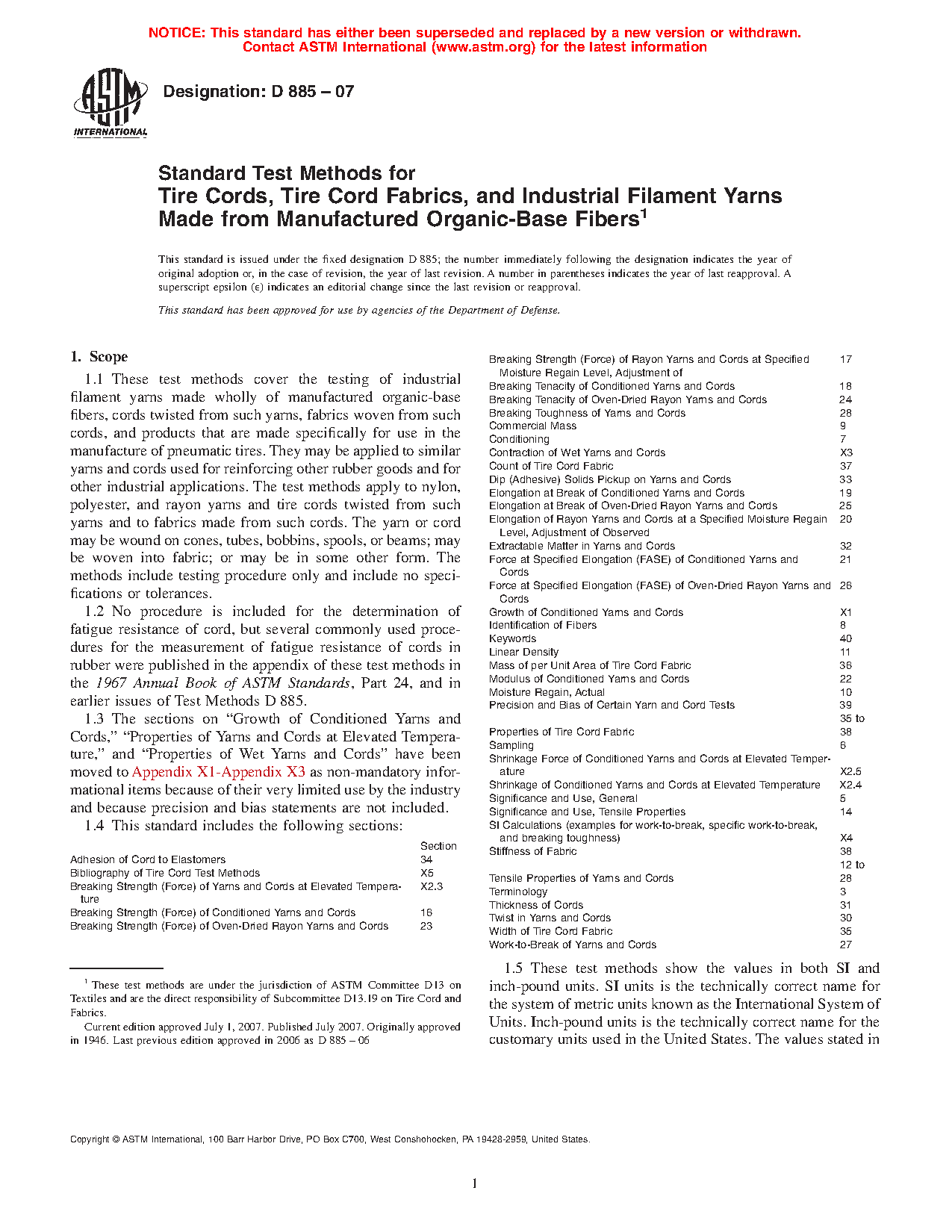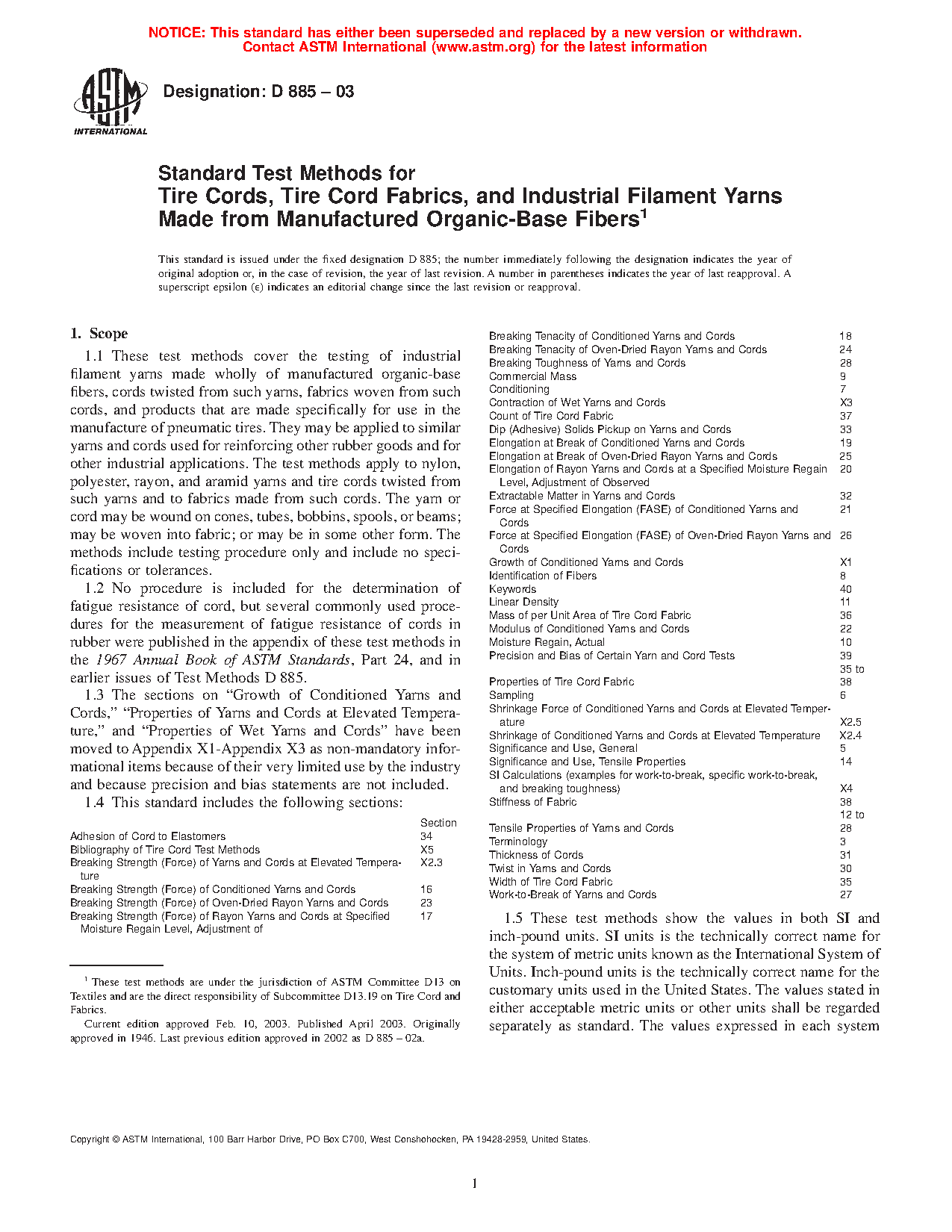 1.3 The sections on "Growth of Conditioned Yarns and Cords," "Properties of Yarns and Cords at Elevated Temperature," and "Properties of Wet Yarns and Cords" have been moved to as non-mandatory informational items because of their very limited use by the industry and because precision and bias statements are not included.
